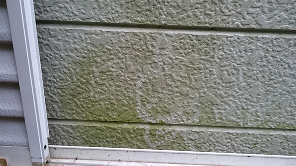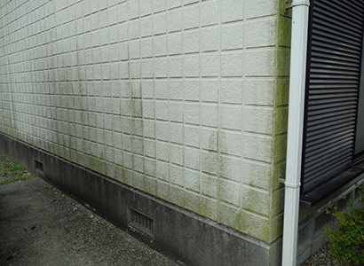 外壁にうっすらと広がる緑色のコケを見て、