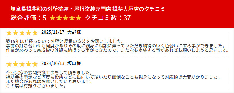 プロタイムズ揖斐大垣店の公式ホームページには、大垣市や揖斐郡、本巣市など地域ごとの施工実績が写真付きで紹介されており、仕上がりのイメージや使用塗料の詳細まで確認できます。