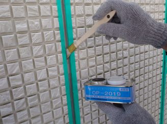 プライマー(接着剤)を塗布していきます。コーキング前には密着性をより高めるためにプライマーは必須です。