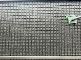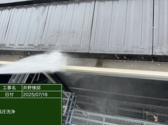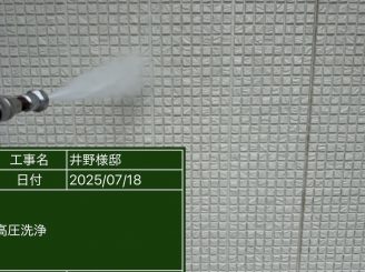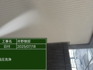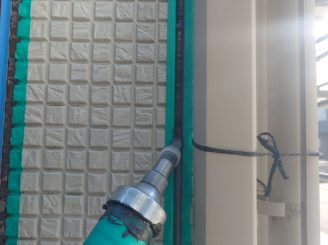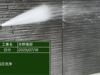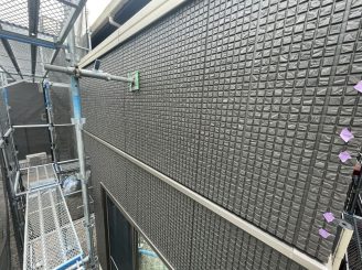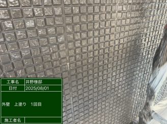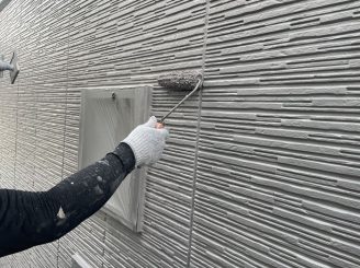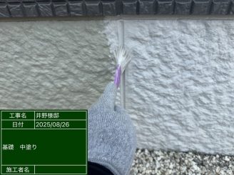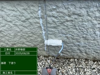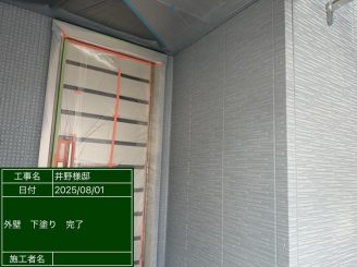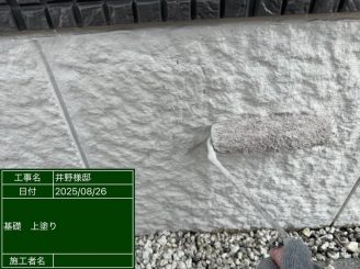 外壁下塗り状況です。既存外壁が光触媒対応の外壁材でしたので対応している2液の下塗り材を選定しました。ここが重要なポイントですね。