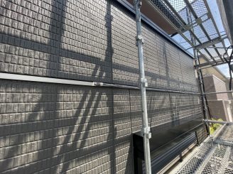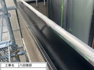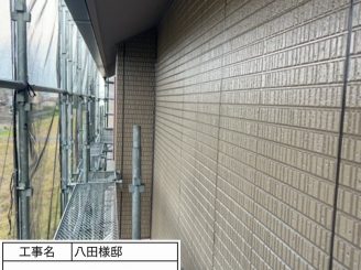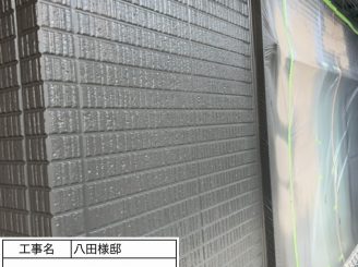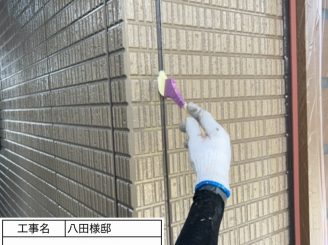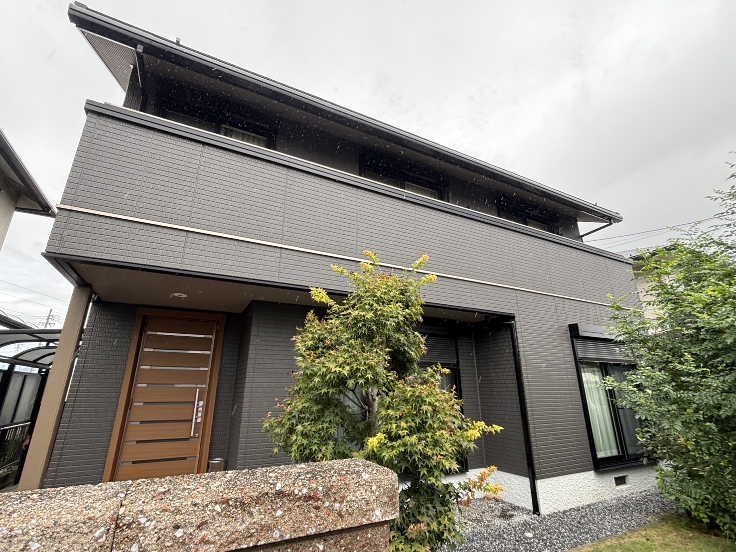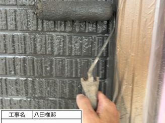 外壁の下塗り作業が完了しました。こちらのお家は密集地ということもあったので塗料が飛散しないように飛散しやすい下塗り材は透明色を選定しました。