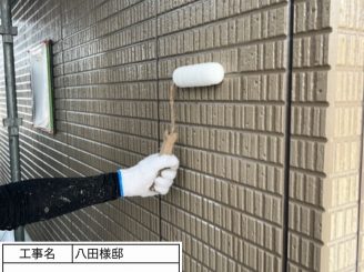 外壁上塗り作業に入ります。凹凸のある外壁材でしたので刷毛で細かく時間をかけて仕上げました。