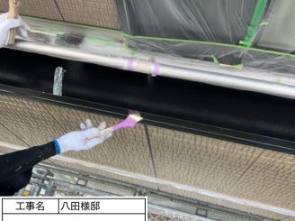 外壁下塗り作業に入ります。まずは刷毛を使って細部までしっかり塗装していきます。