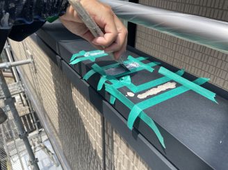ベランダの笠木がサイディング素材でしたので欠損箇所は数カ所ありました。なので塗装前に欠損部分をしっかり補修しました。