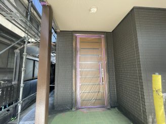 外壁の上塗り作業が完了しました。軒天は茶色色でしたが8083(ベイジュ)で全体的に暗くならないようにしました。玄関周りも明るくなりました。