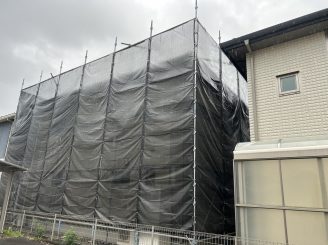 足場組立作業 お隣との距離が近い時も足場はしっかり立てれますのでご安心ください。