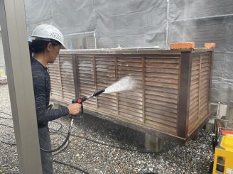 サービスで木のフェンスも木を傷めないように水圧を配慮しながら洗浄していきます。