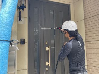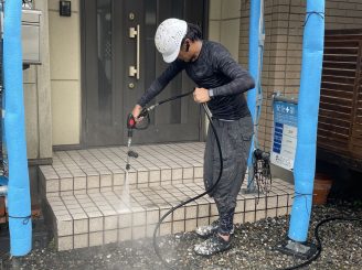 玄関ドアの前のタイル土間もしっかり洗浄していきます。