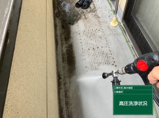 ベランダ床には汚れがすごく付着してるので念入りに洗浄していきます。