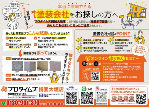 イベント開催情報 EVENT ※営業行為は一切行ないませんので 安心してご参加ください。 開催日 2024/05/18(土) 時間 20:00~21:30 ※Zoom参加19:50分から 会場 オンラインです 講師 外装劣化診断士・雨漏れ診断士 講師:筒浦広幸 イベント内容 Zoomwo使用して外壁のメンテナンスの際に気を付けるポイントや業界の裏話など面白い情報を発信します。 イベントチラシ [ピックアップ] お家の健康診断 外壁塗装のトラブルがなくならない理由 見積書の見方 外壁塗装の塗り替えサイン ドローン診断 重要な屋根・外壁塗色選び リフォームローン